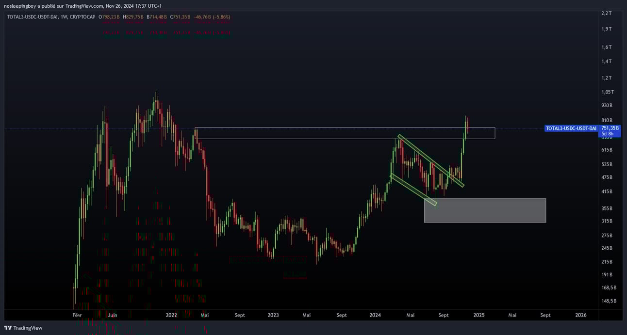 TOTAL3 en hausse : La capitalisation des altcoins, excluant BTC, ETH et les stablecoins, a franchi une résistance clé datant de mars. Ce signal technique suggÚre une poursuite de la hausse, soutenue par des liquidités issues des prises de profit sur BTC.