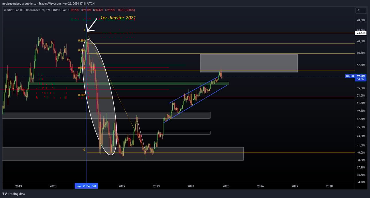 BTC Dominance : La dominance de Bitcoin montre des signes de faiblesse, revenant à un niveau critique de Fibonacci (0.618), similaire à celui qui avait déclenché une altseason majeure en 2021. Cette répétition historique pourrait indiquer un nouveau cycle favorable pour les altcoins.