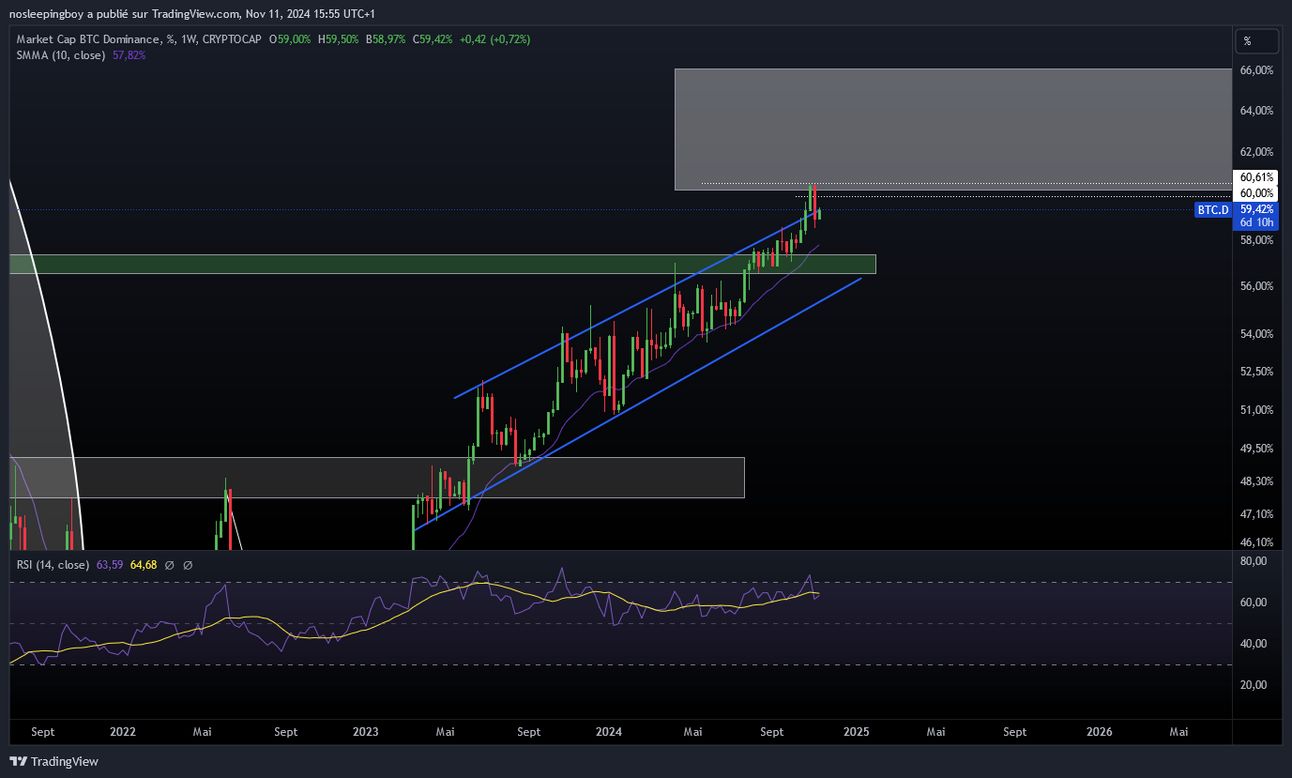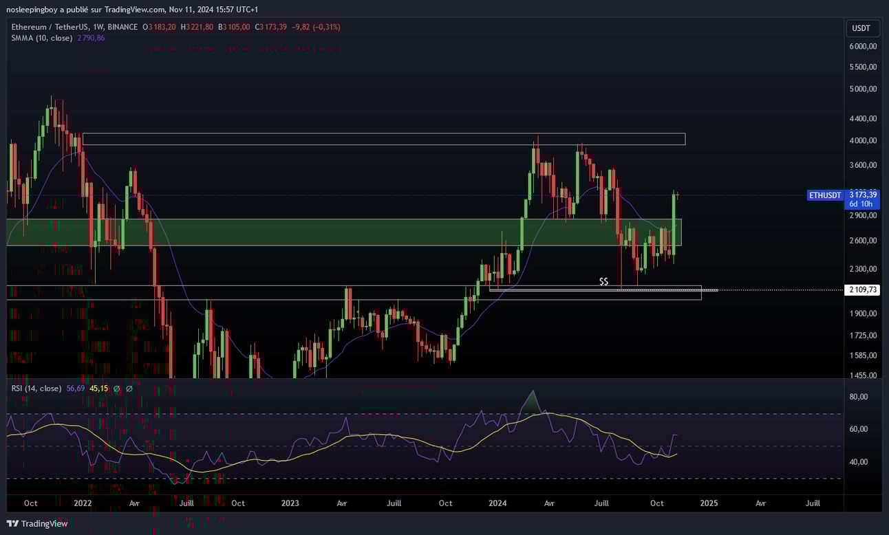 Franchissement dâune rĂ©sistance majeure : Contre le dollar, ETH a enfin brisĂ© une zone de rĂ©sistance importante et une moyenne mobile clĂ©, la SMMA 10, qui bloquait son ascension depuis plusieurs semaines. Ce break ouvre potentiellement la voie vers les 4000 $, avec un double sommet en ligne de mire Ă moyen terme.