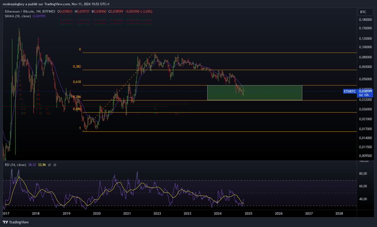 Rebond de la paire ETH/BTC : Ethereum montre une reprise solide face à Bitcoin, rebondissant sur une zone critique de Fibonacci (0.618-0.786), qui pourrait marquer un point de retournement stratégique pour ETH.