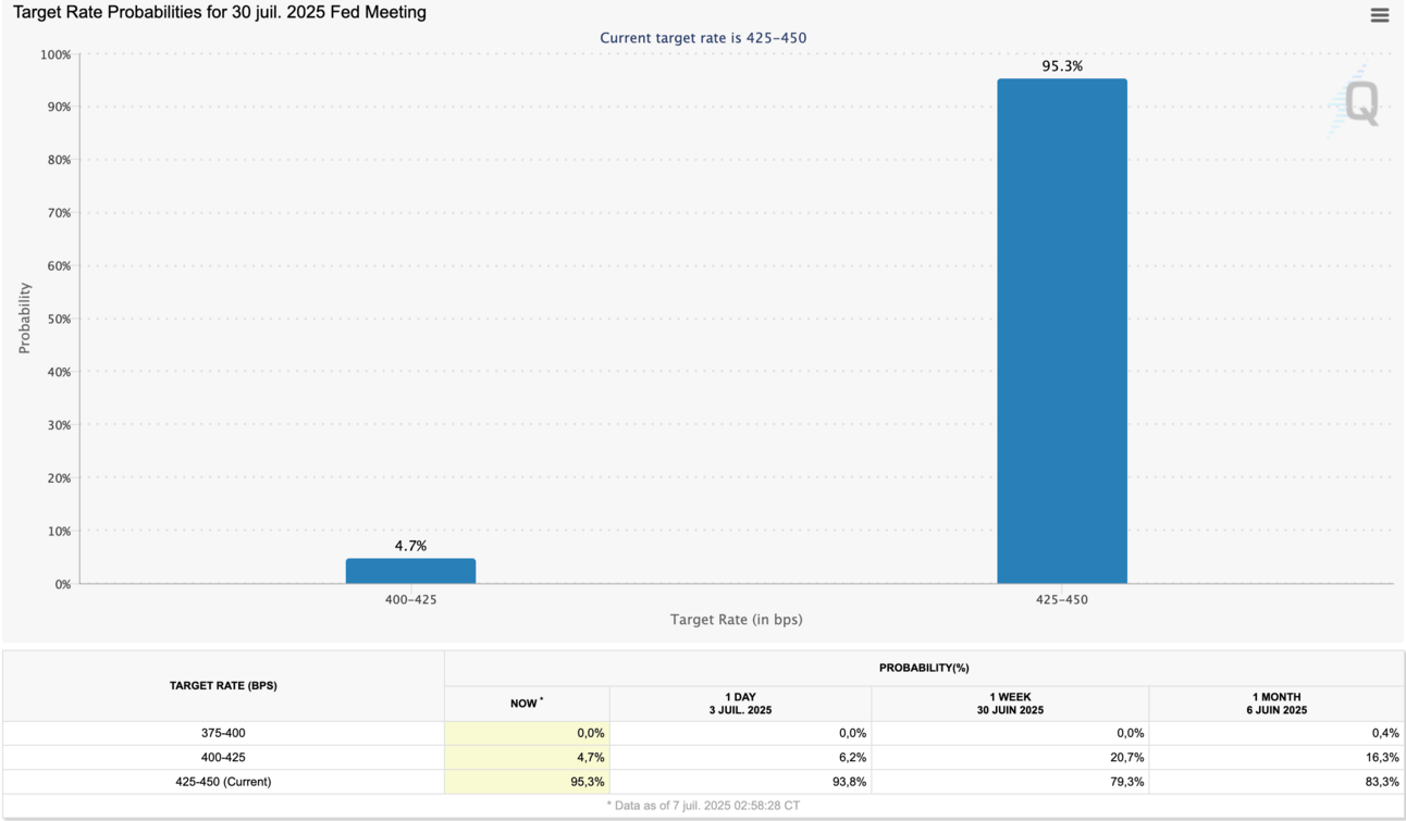 Nouveau consensus : on parle dĂ©sormais deux baisses de taux max (Septembre et Octobre) sur Q4 2025 contre 3 avant le rapport sur lÂŽemploi, et seulement si lâĂ©conomie montre des signes clairs de ralentissement.