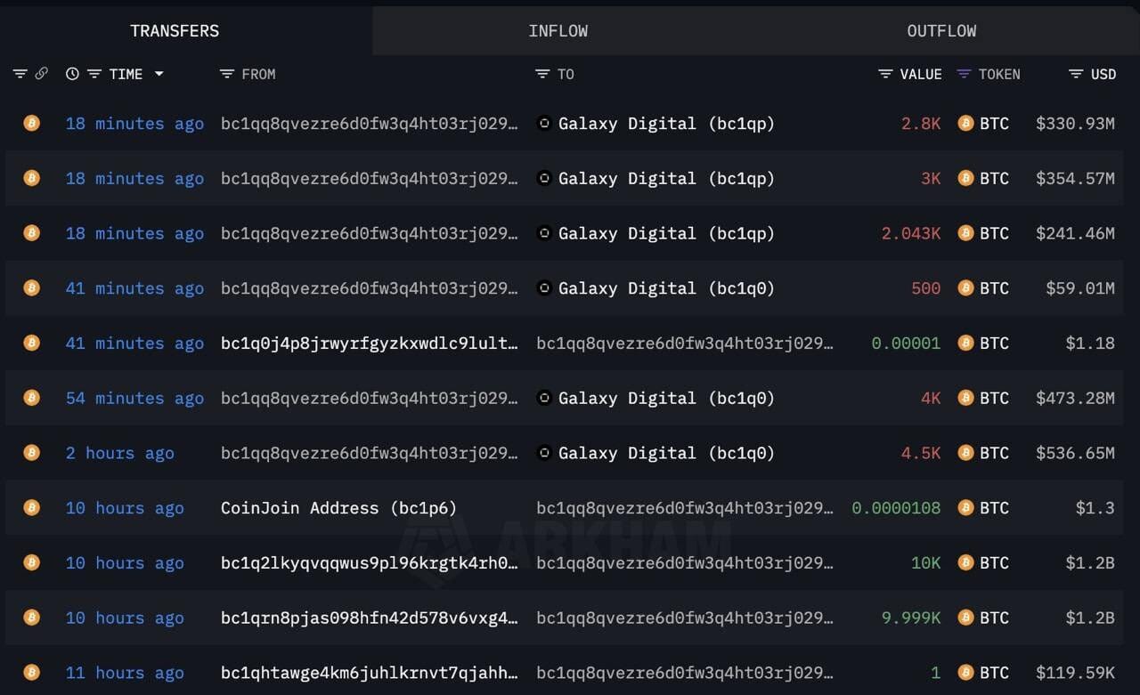 Lâenvoi vers Galaxy Digital indique trĂšs probablement une intention de vente OTC, pour Ă©viter de tout dĂ©verser sur le marchĂ© spot.